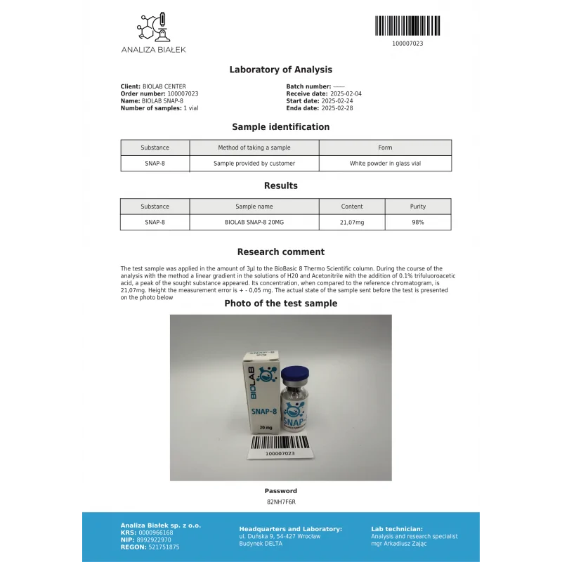 SNAP-8 20mg is a high-purity research peptide designed for advanced laboratory studies in neuromodulation, receptor signaling, and synaptic pathways.